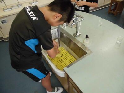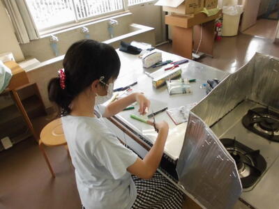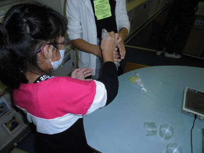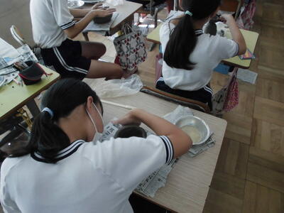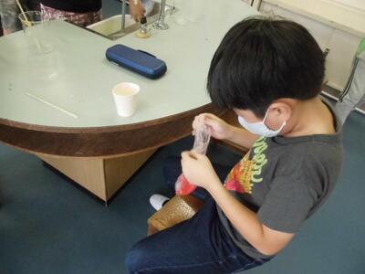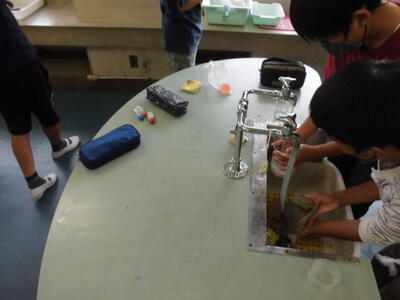 ↓ 科学クラブでは、スライムをつくる実験をしました。それぞれのこのみの色や形に調節して、不思議な感触のスライムができあがりました。
