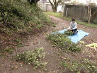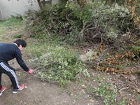 ( ↓ 校長先生が敷地内で伐採した枝や木を片付けています。学校応援のボランティアの方にも、ご協力いただきました。)
