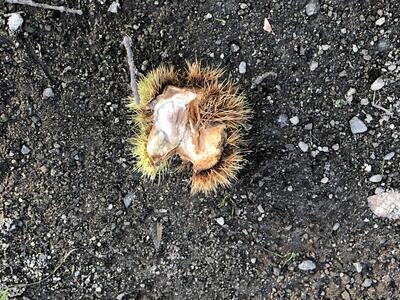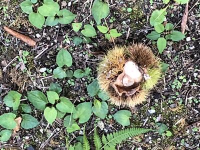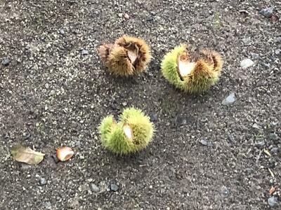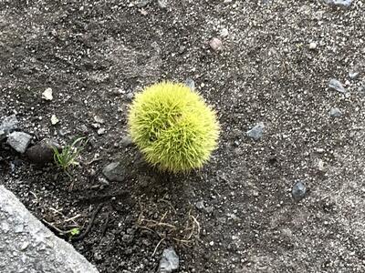 十月になり、学校でも秋が深まってきています。このブログでも何回か紹介した学校のクリも、落ちてはじけて、クリの実が散らばっています。