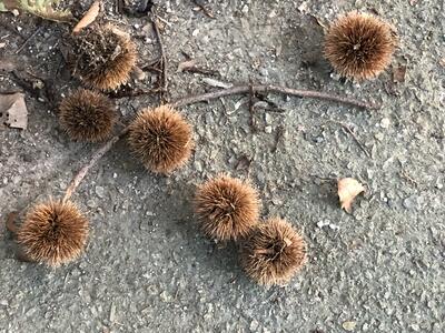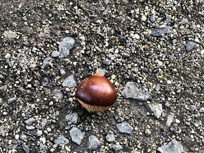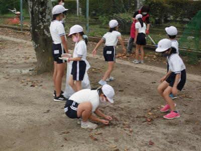 学校にはたくさんの樹木があり、実りの秋でもある現在、たくさんの木の実が落ちています。