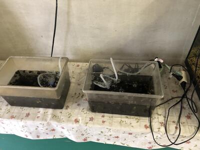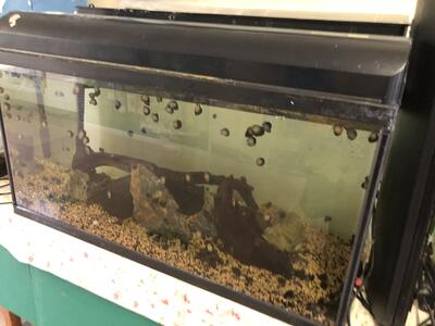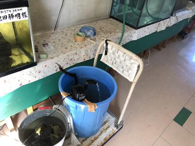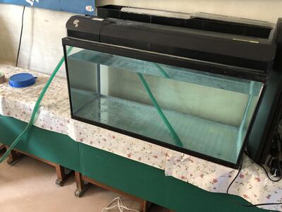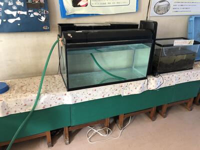 ( ↓ 用務員さんが、水槽を直してくれました。水が漏れていたのを、コーキングなどで直して、この水槽でタニシや他の魚を育成します。)