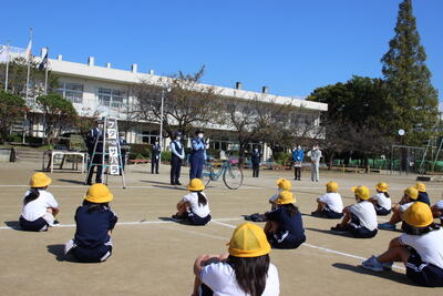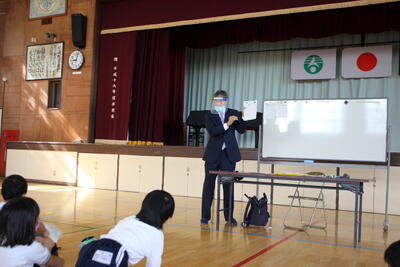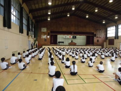 ( ↓ 学校安全担当の先生と、校長先生のお話がありました。皆、真剣に聞いています。)