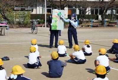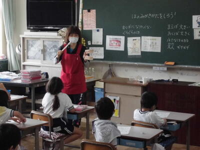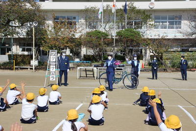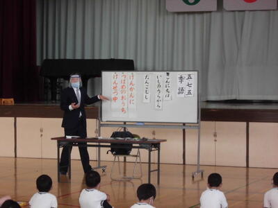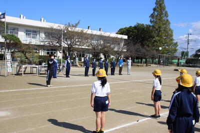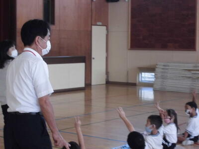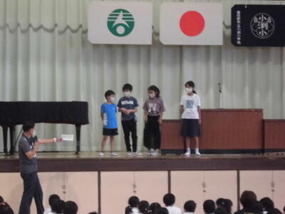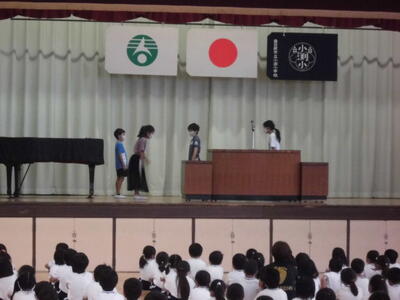 ↑ 今月の生活目標は『自分から先にあいさつをし、返事ははっきりとします』です。三年生の先生と子供たちによる、今月の生活目標の確認がありました。三年生代表の子供たちがあいさつについて、実演して見せてくれました。