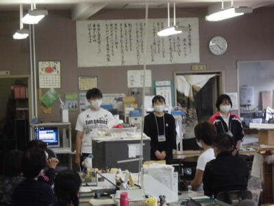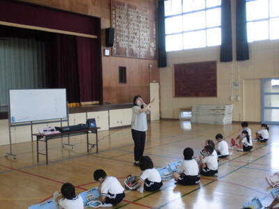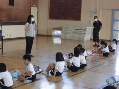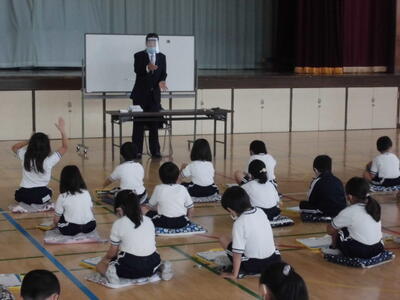 (密を避けるために体育館でおこないました。講師の方のお話をしっかり聞いています。))