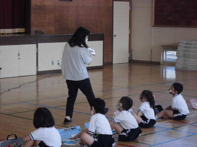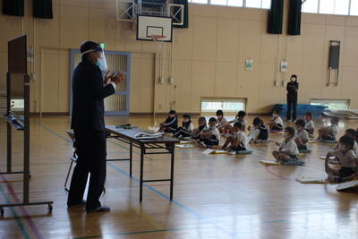 ↑ 学校ではまだ、集まる場合には、マスクを着用し、周りとの間隔をじゅうぶんにとって集まるようにします。体育館では、体育館いっぱいに広がって密を避けます。