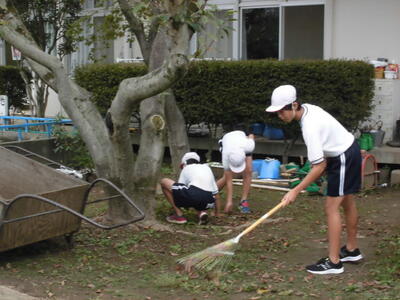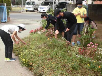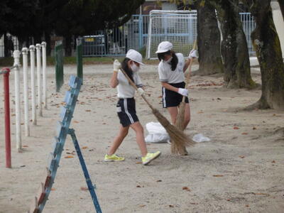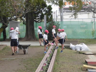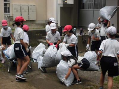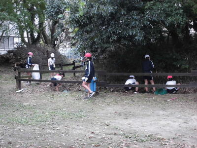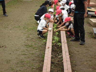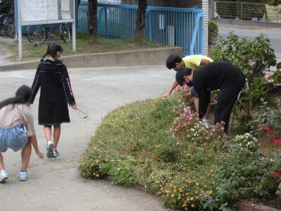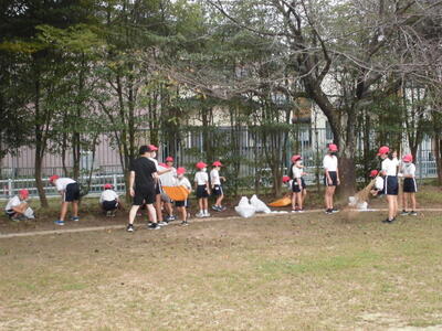 今回は、1~6年生のまでの異年齢集団のたてわり班にわかれて、班ごとに上級生のリーダーシップのもと、校庭で美化活動をおこないました。