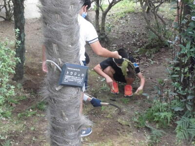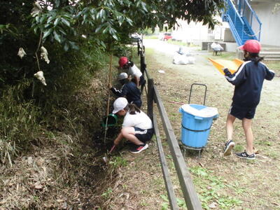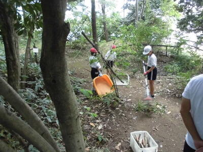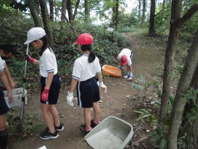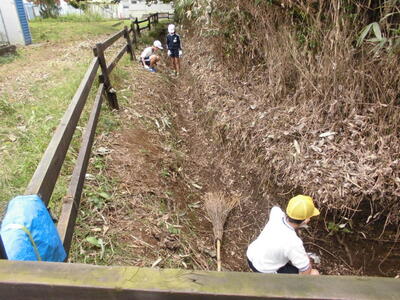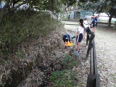 4年生が総合的な学習の時間で、小渕小の自然環境について学習しています。小渕小の自然の森(通称:トトロの森)では、担当グループがホタルの池や水路、その周辺をきれいにしました。