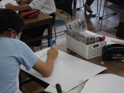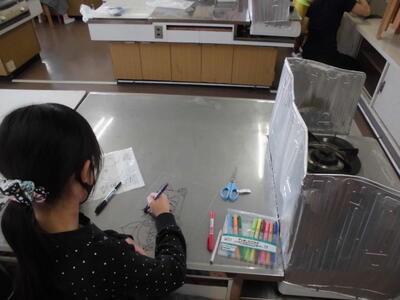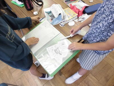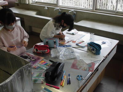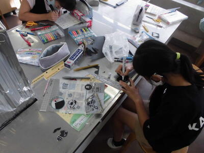 ↓ 手芸・アートクラブでは、プラ板を作成しています。プラスチックの板に絵を描いて、レンジで加熱して圧縮しています。