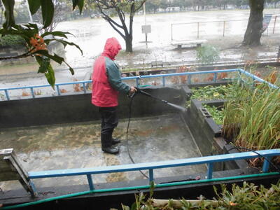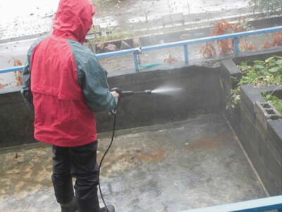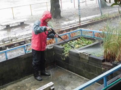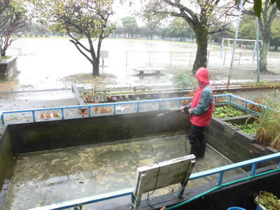 (池の底や壁面は、昨日、4年生がきれいに汚れを落としてくれました。校長先生が、細かいところの取れにくかった汚れを洗浄機で落としています。)