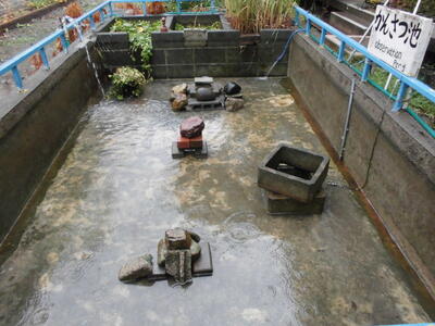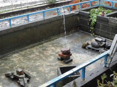 ( ↓ 池の水がぜんぶ抜けました。池の底や、壁面、魚のかくれ家になる岩やブロックもきれいにしました。後日、また池に水を張って、きれいになった池に魚たちを戻します。)