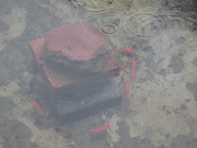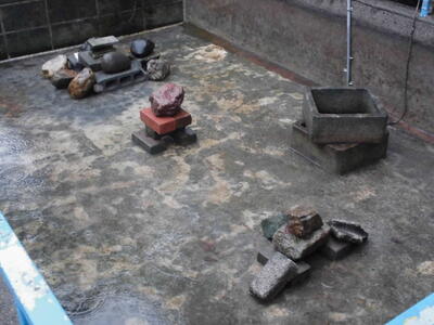 (きれいになった観察池に、魚のかくれ家となる岩やブロックを置いて、水を張り始めました。)