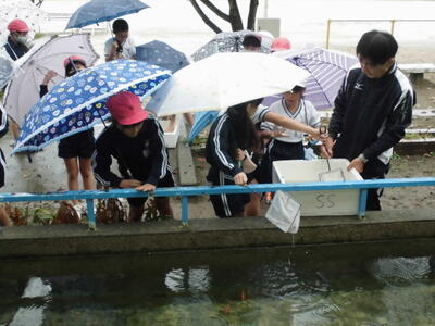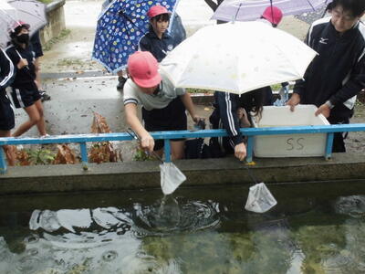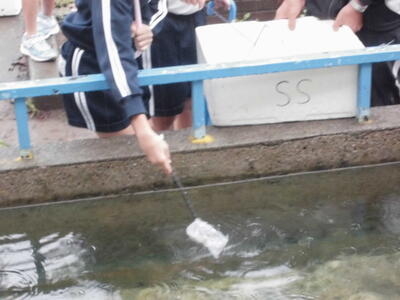 ( ↓ 子供たちが、少しずつ、網で魚を池に戻していきます。)