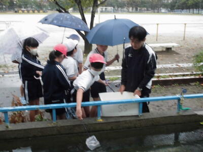 ( ↓ 午後、4年生が、池の中に入って、魚やヤゴを網ですくって別の水槽にうつしました。)