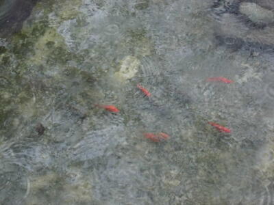 ( ↓ 写真では赤い魚が目立ちますが、実際には黒い魚がたくさんいます。)