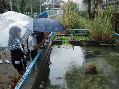 昨日の小渕小ブログで紹介した、観察池の水抜き(4年生が、総合的な学習の時間で、観察池をきれいにしてくれました。)。