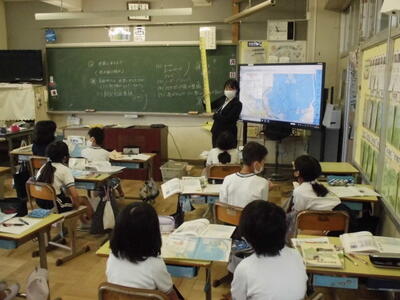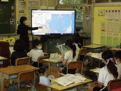 ( ↑ 4年生の社会の様子です。資料や電子黒板を活用して、春日部市の水害対策についての授業です。)
