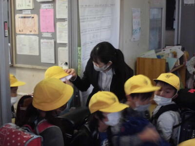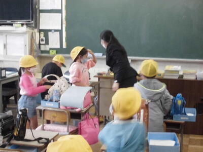 ( ↑ 2年生の帰りの様子。帰りの会で、子供たちと忘れ物がないか確認したり、準備を見守ったりしています。)