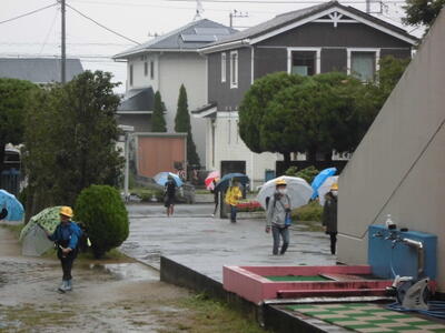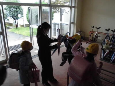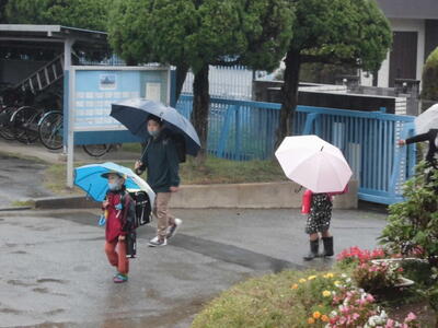 本日、第三土曜日は授業日です。冷たい雨の朝となりましたが、子供たちがカサをさして登校しています。
