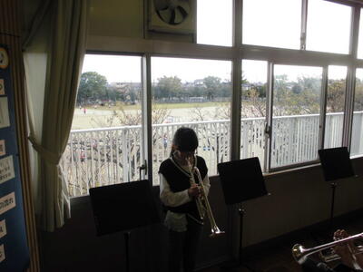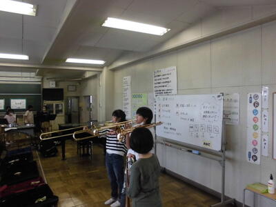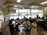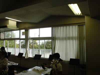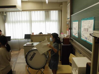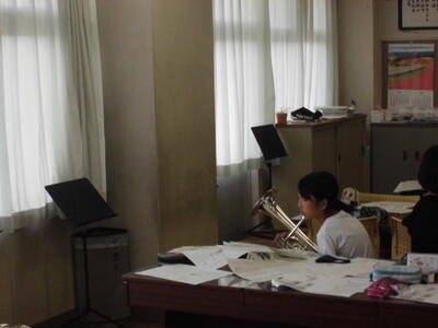 ↓ 器楽クラブの活動です。感染症対策のため、窓やドアをあけ換気をじゅうぶんにしながら、なるべく周りと離れて個人で楽器の練習をしています。