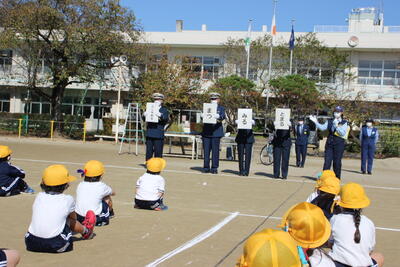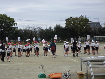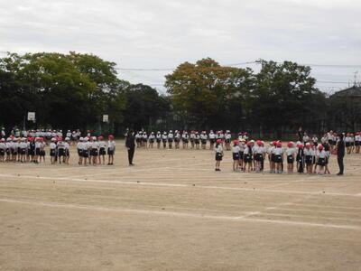 本日の朝は音楽朝会がありました。感染症対策のため、校庭で、マスクを着用して、児童同士の間隔をあけておこないました。全校児童で、今月の歌を歌いました。音楽の先生のアドバイスで、髙い声を出す練習や、三連符の発生の仕方を練習しながら、子供たちのさわやかな歌声が、秋の空に響きました。