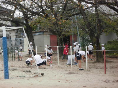 7:20 先生たちが校庭で陸上大会のための準備を始めています。