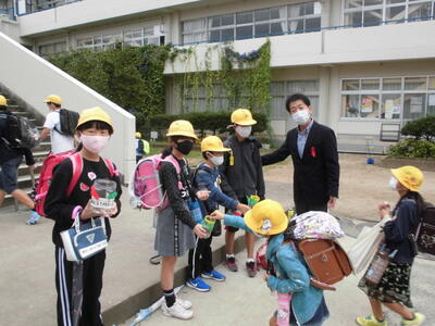 ( ↓ ぶじに学校まで帰ってきて、子供たちの進行到着式です。クラス代表の子供たちが感想を発表しました。)