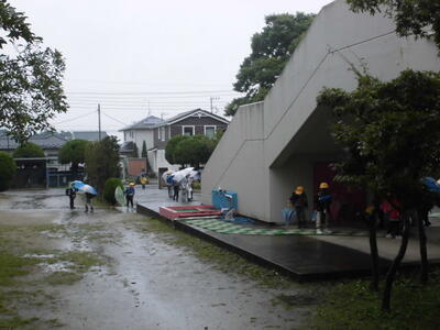 ( ↓ 放送による避難指示で、それぞれの場所から校庭の集合場所にむかいます。)