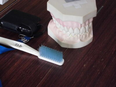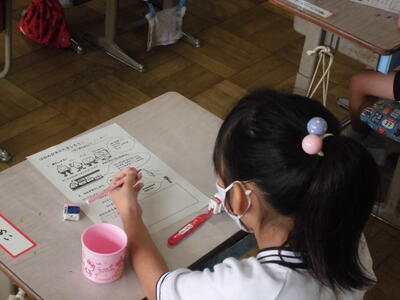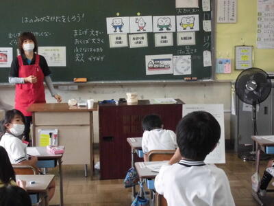 ( ↓ 本日、5年生の教室では、保健の先生による「歯みがき教室」の授業がおこなわれました。映像などで確認しながら、実際に歯みがきをしてみました。)