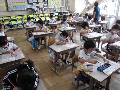 本日は、学習参観(授業参観)です。感染症拡大防止のため、一学期には実施できませんでしたので、今年度始めて教室での授業のようすを保護者の方に見ていただきました。ただ、いまだ感染症拡大は終息していませんので、本日の参観は保護者の方のみ対象(各家庭よりお一人ずつ)とし、また校内や教室での密を避けるため4校時と5校時に分散して来校いただきました。