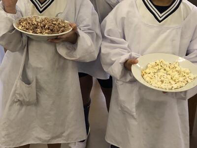 たんぽぽ・ひまわり学級では、一学期から種を植えてポップコーン用のトウモロコシを育てました。二学期に収穫したトウモロコシの実がじゅうぶんに乾燥したので、今日、ポップコーン作りに挑戦しました。