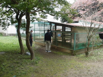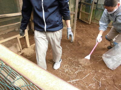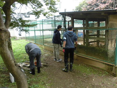 本日、おやじの会の活動がありました。学校のウサギ小屋が、ウサギたちによって穴が掘られたり柱がかじられたりして、傾いてきたので、直していただきました。