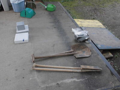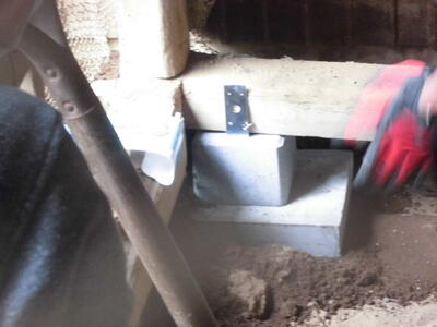 ( ↓ コンクリートブロックを柱の土台に入れて、柱を安定させています。)