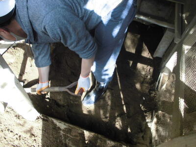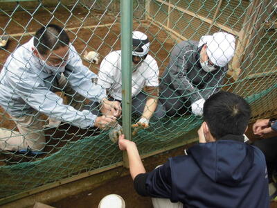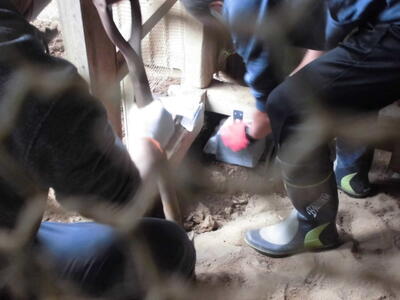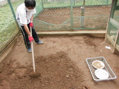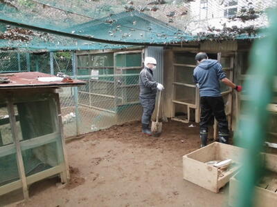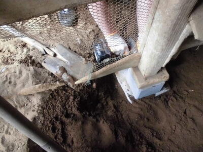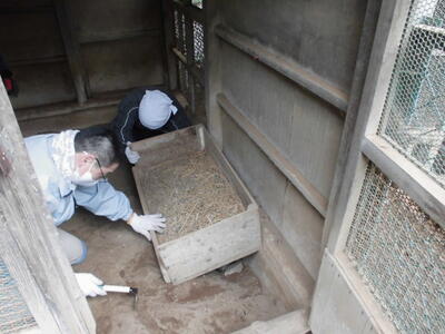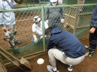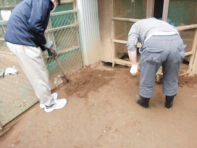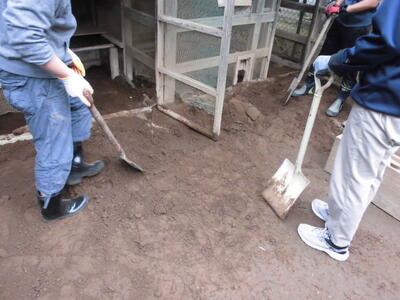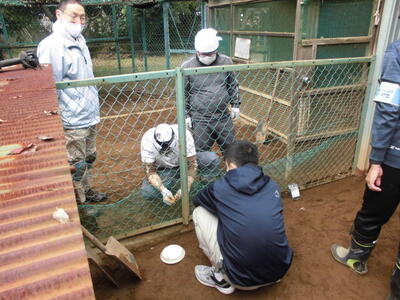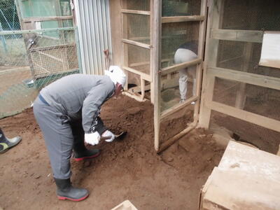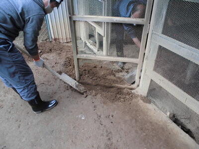 ( ↓ ウサギが掘った穴をうめたり、不安定になった柱を固定したりします。)