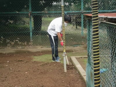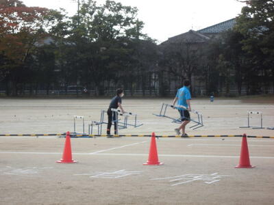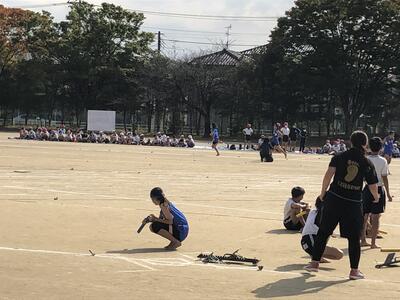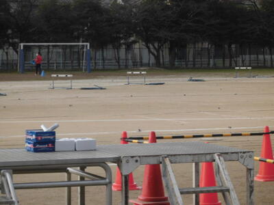 7:20 先生たちが校庭で陸上大会のための準備を始めています。