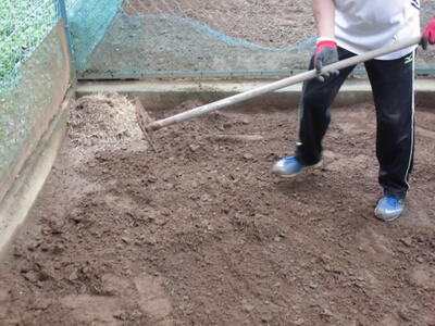 ( ↓ 土を入れて、地面をならします。)