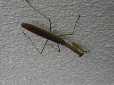 学校の壁にカマキリがいました。夏の緑色ではなく、秋らしい体の色をしています。