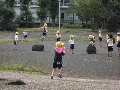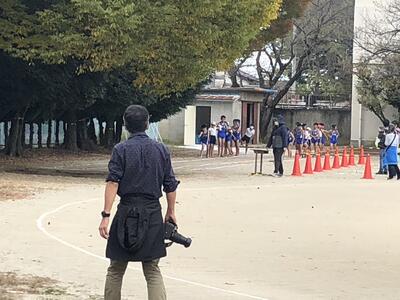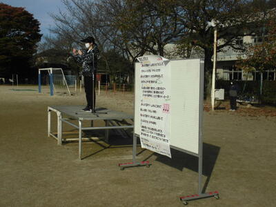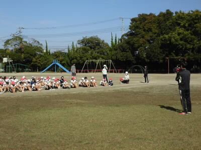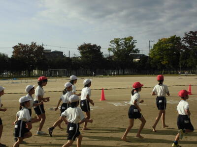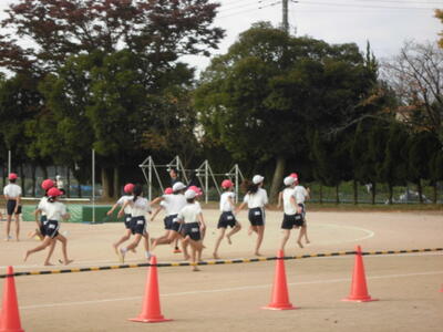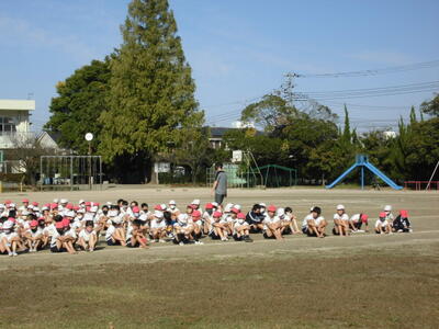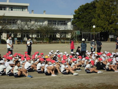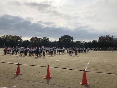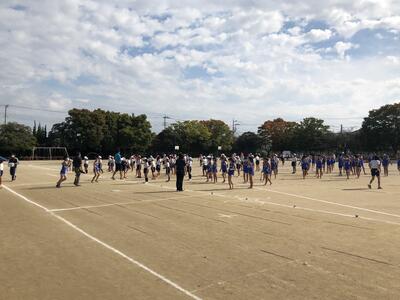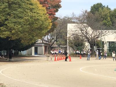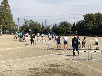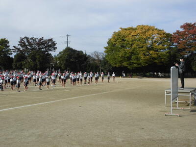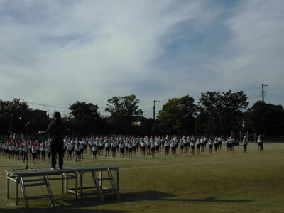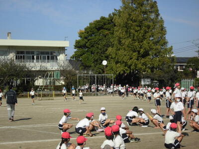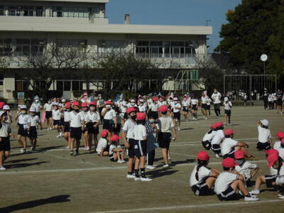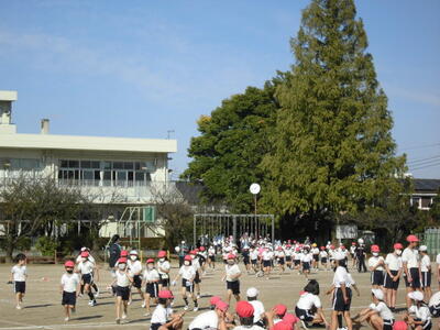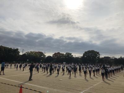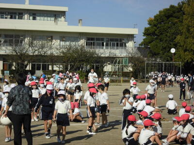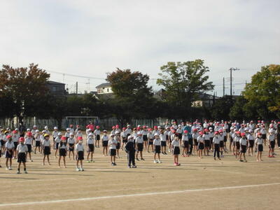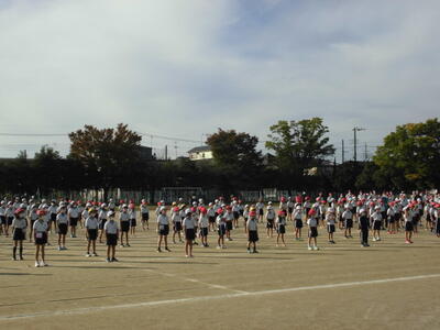 7:50 毎朝の一運動(いちうんどう)が始まっています。陸上大会は4年生以上ですが、1~3年生も朝の運動は元気に参加しています。