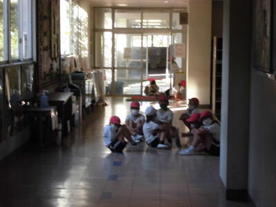 ( ↓ 地震発生の放送です。廊下にいた子供たちは、その場でしゃがみこんで揺れがおさまるのを待っています。)