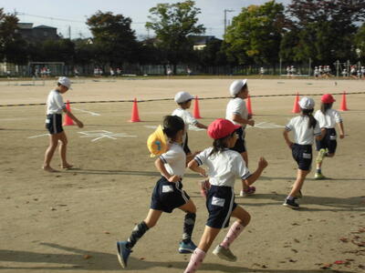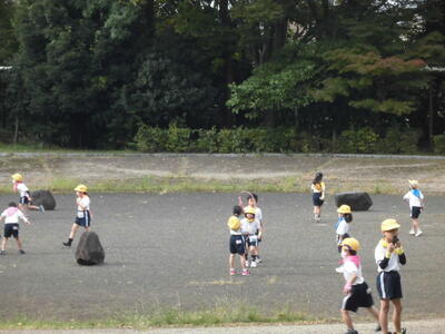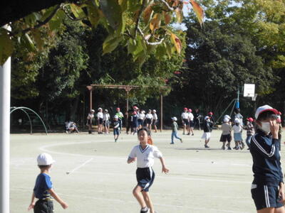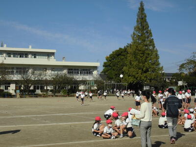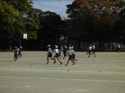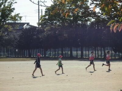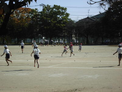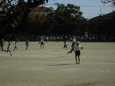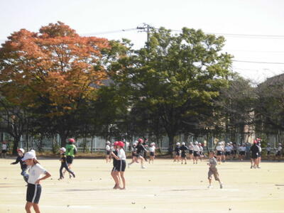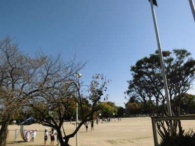 秋晴れの空の下、昼休みには、子供たちが校庭を元気に走り回っています。