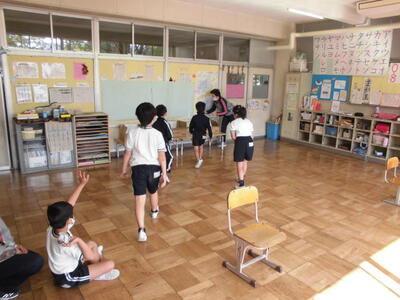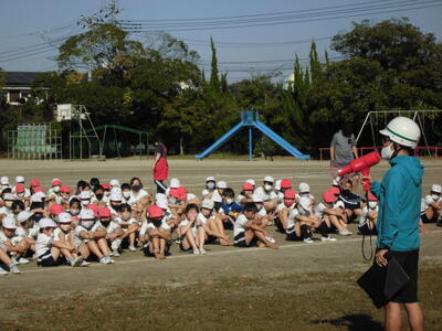 本日の朝は音楽朝会がありました。感染症対策のため、校庭で、マスクを着用して、児童同士の間隔をあけておこないました。全校児童で、今月の歌を歌いました。音楽の先生のアドバイスで、髙い声を出す練習や、三連符の発生の仕方を練習しながら、子供たちのさわやかな歌声が、秋の空に響きました。