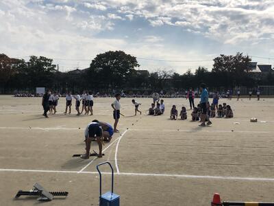 本日は、一学期に実施できなかった市内陸上大会に代えて、校内陸上大会です。校内で4~6年生がそれぞれエントリーした種目で記録をめざします。