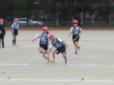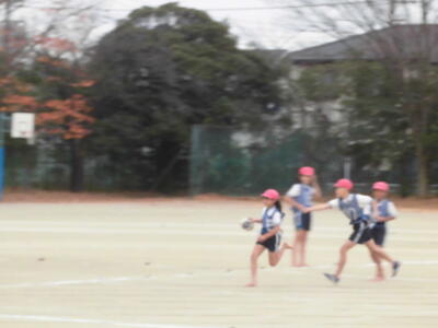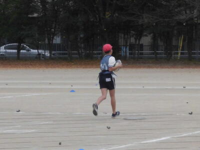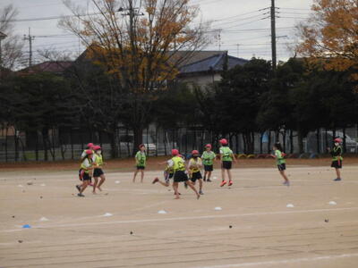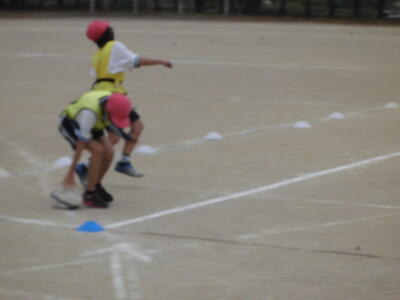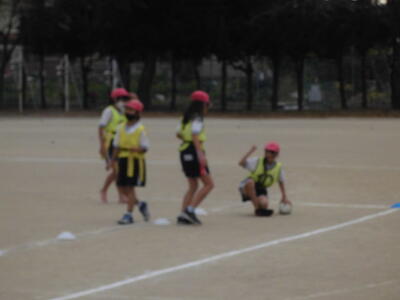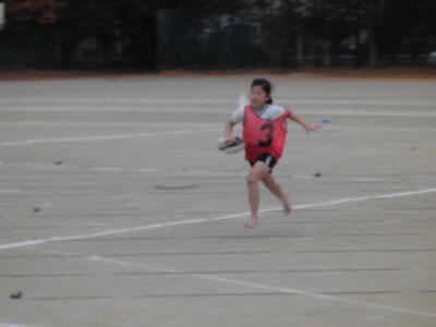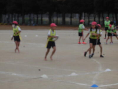 ↓ 4年生が、体育の授業でタグ・ラグビーをおこなっています。(ラグビーのルールに近いですが、タックルする代わりにボールを持った相手の腰のタグをとることで、攻撃を止められます。)