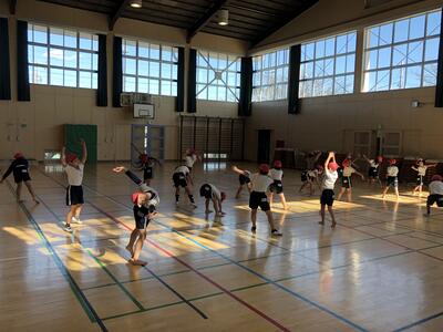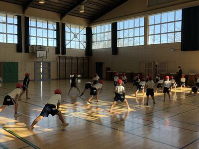 ( ↑ 2年生の体育の様子。準備運動で体をほぐしています。)