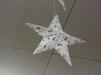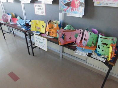 2年生の廊下では、「カッターナイフタワー」の作品がならんでいます。子供たちが、紙を切っていろいろな形のオリジナルのタワーつくりあげました。