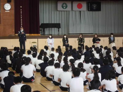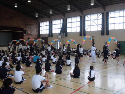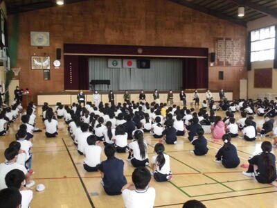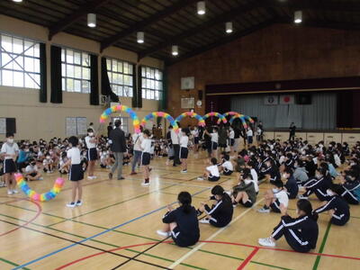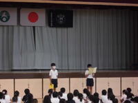 8:15 体育館で開会式です。密を避けて、児童間の間隔をあけています。校長先生の話や児童代表の決意の言葉がありました。