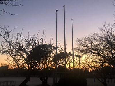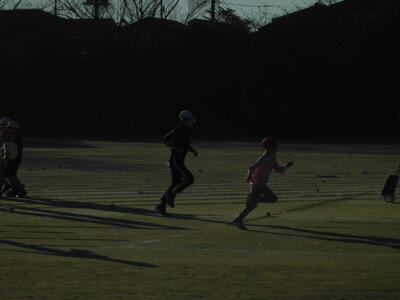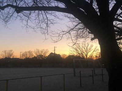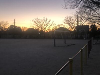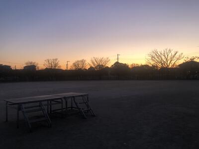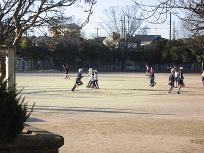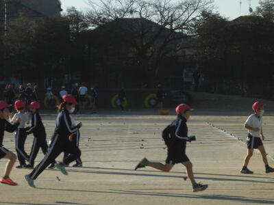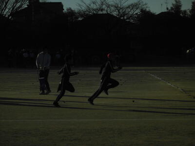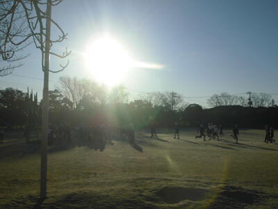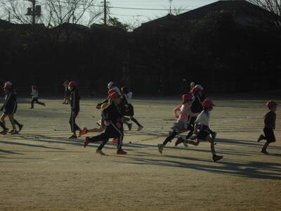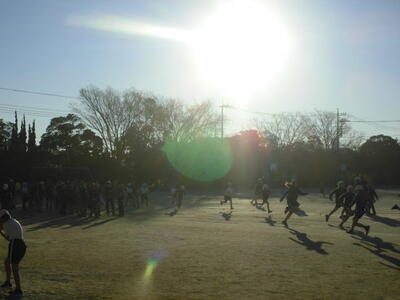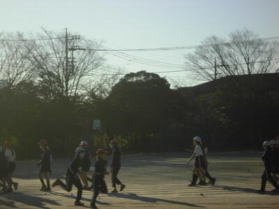 冬の朝日を浴びて、子供たちが元気に校庭を駆けています。