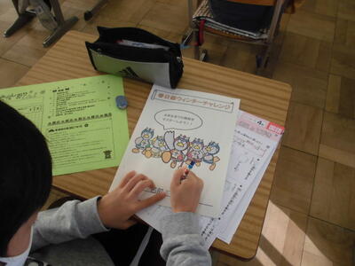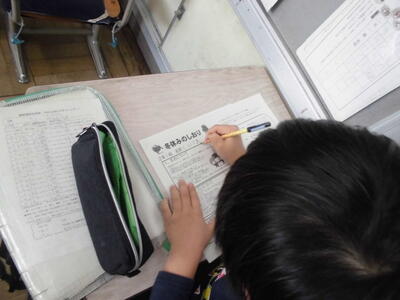 ↓ 春日部市のオリジナル学習教材「春日部ウインターチャレンジ」が配られ名前を記入したり、冬休みのしおりに生活目標を書いたりしています。