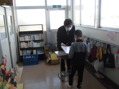 ↓ 担任の先生から通知表「のびゆく子」が手渡されています。