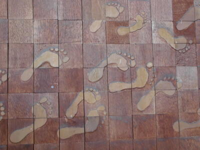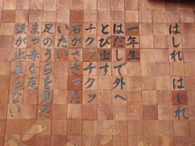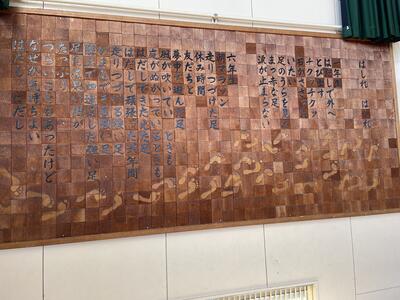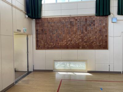 本校では、開校2年目より続けている、はだしの教育が40年目となりました。体育館には、はだしの小渕っ子の気持ちをあらわしたパネルがかざられています。
