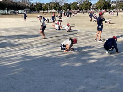 冬でもはだしで校庭を駆ける子もいます。ランニングをしたあと、整理体操、そして全員で石拾いをおこないました。